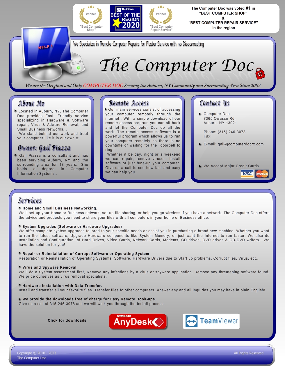 The Computer Doc specializes in Remote Assistance in Home and Small Business Network Solutions, Computer Maintenance, Repairs and Upgrades. We "Strive for Excellence" and Stand behind our Services . . .